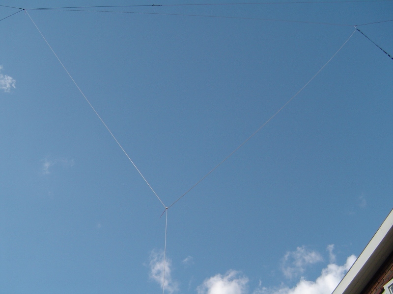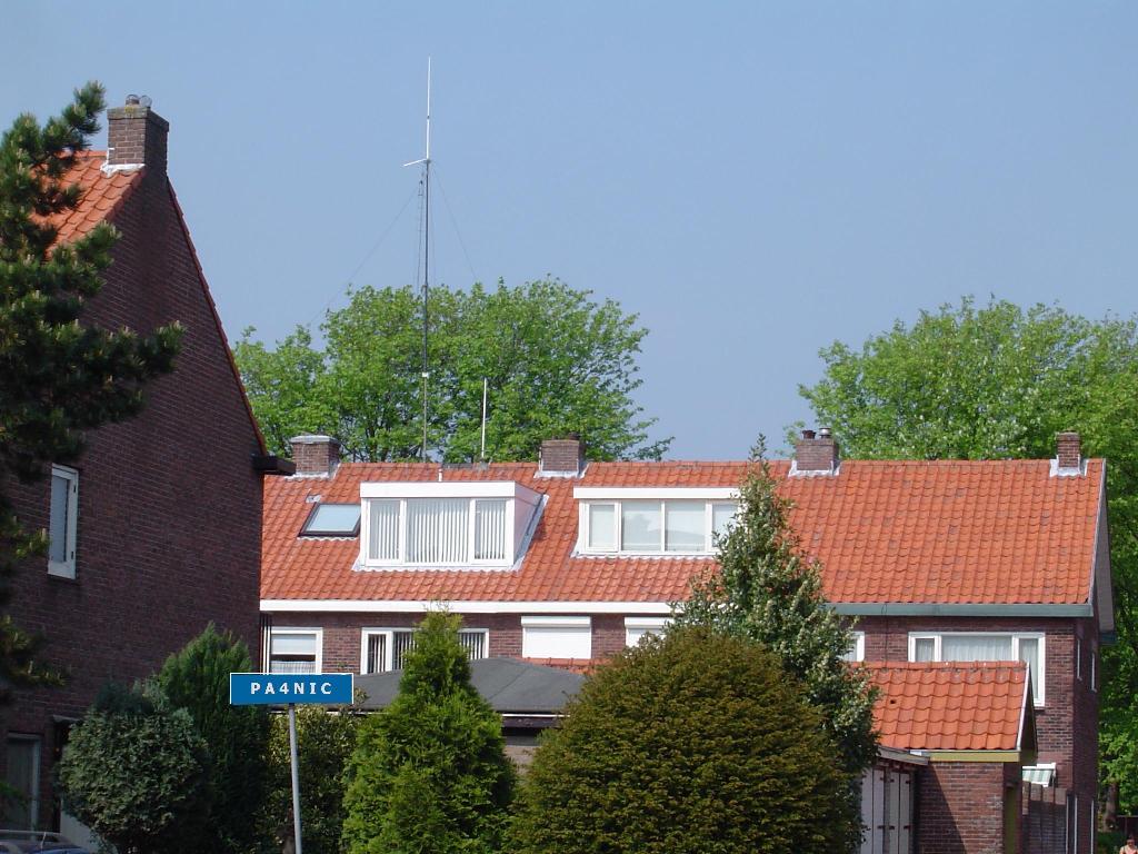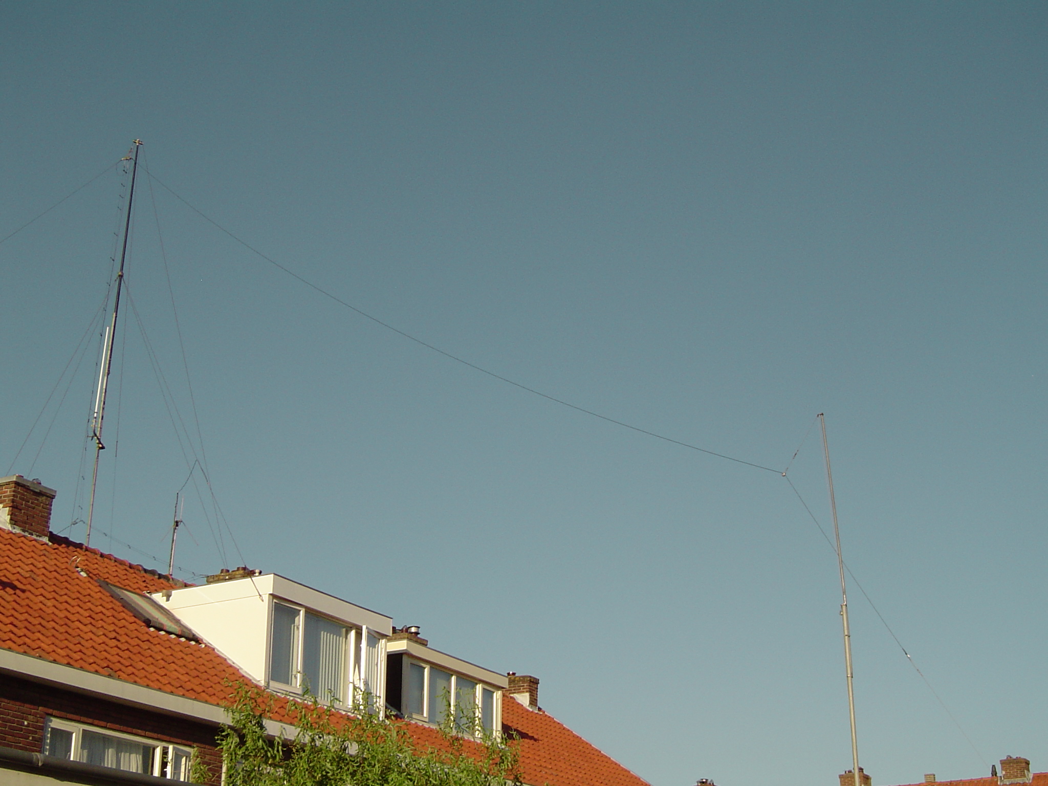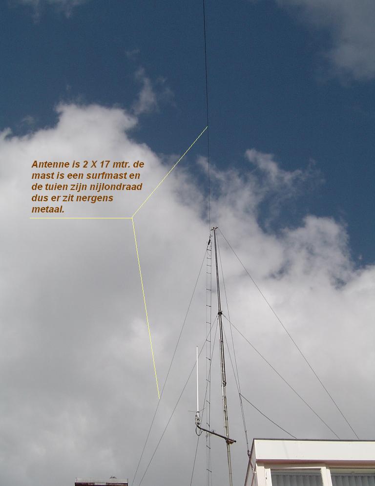 De huidige antenne is 2 x 17 mtr. en werkt zelfs nog op 160 mtr. (hangt overal behoorlijk vrij).