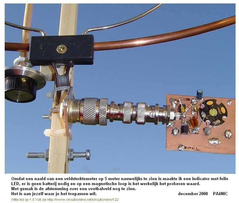 Voor de amateurs die de naald van een veldsterkte meter op enige afstand niet meer kunnen bedacht ik een indicator met helder witte LED