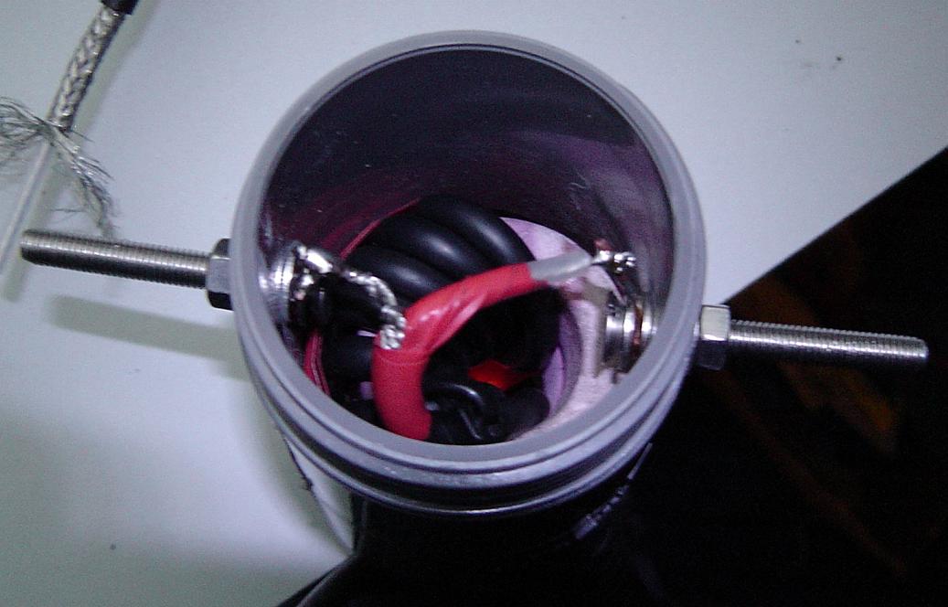 De binnenzijde, de aansluitdraden kort en gelijk van lengte.