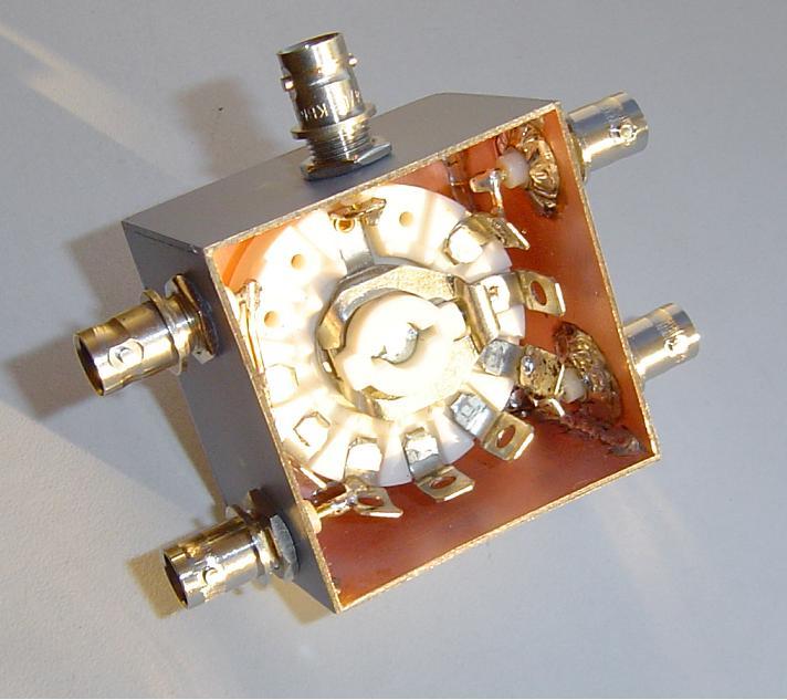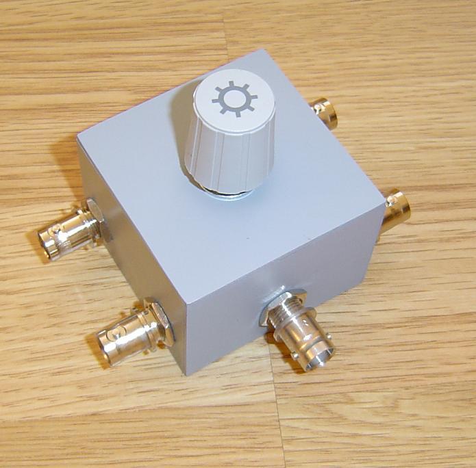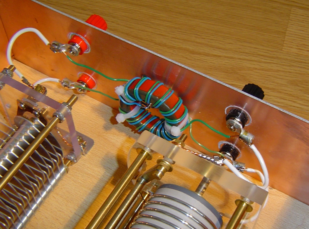 De stroombalun (Balanced-Unbalanced) in zijn behuizing... 6 wikkelingen op 2 x 4C65 ringkernen (zo'n 14 uH).
